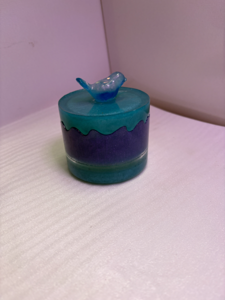 A hand poured resin trinket box in ocean blues and purples, topped with a whimsical bluebird. Perfect for holding tiny treasures - this piece brings a gentle pop of color and a touch of playfulness to any space.