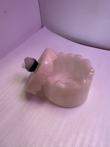 A delicate, hand-poured resin jar in a soft blush pink, finished with a scalloped edge and matching lid with wee bird handle. Perfect for holding tiny treasures or adding a gentle shimmer to your space.