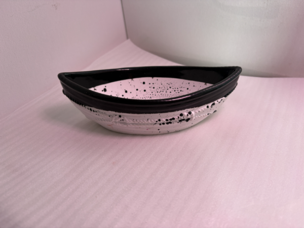 A sleek, boat shaped bowl with bold black and white contrast. Testures with resin and resincrete finished with expressive splatter details - modern, functional, and full of character.