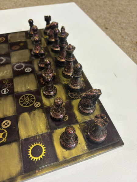 Handmade Chess set with shimmering pieces and golden gears. A One-of-a-kind board for game lovers and collectors - play with a touch of magic and metal.