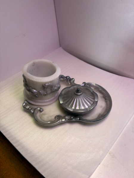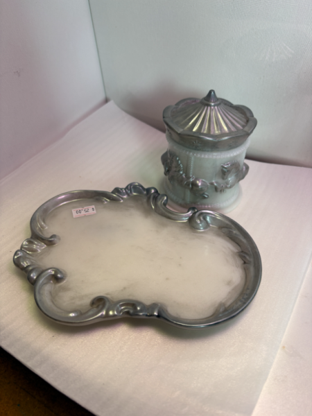 A whimsical carousel jar and matching tray, finished in silver and white. Perfect for jewellery, keepsakes, or adding a touch of vintage charm to your space.