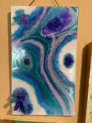 A vibrant resin artwork inspired by geodes and flowing water. Layers of blue, teal and purple shimmer with embedded crystals - inviting you to explore the energy and movement within each sparkling line.