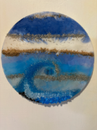 A round resin art capturing the energy of the ocean. Layers of blue, white, and shimmering crystals evoke the movement and sparkle of a breaking wave - inviting you to feel the sea's power and calm.