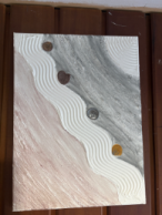 Textured waves flow between soft earth and stone tones, accented by embedded "coins". This piece explores movement, transition, and the value found in life's shifting paths.