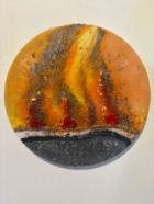 A dynamic, round artwork capturing volcanic energy with molten resin, crushed glass, and textured layers. Fiery oranges and reds burst against deep black - celebrating nature's raw power and transformation.