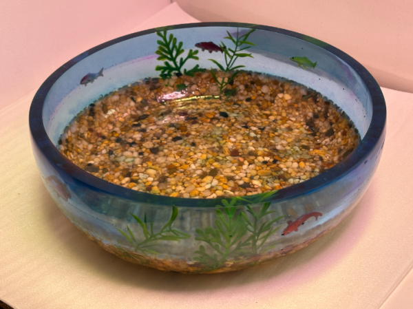 A resin bowl capturing the feel of a lively river bed - pebbles, fish, and aquatic plants susspended in clear layers. Fanctional art that brings a touch of nature indoors.