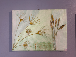 Delicate botanical forms rise in gold relief against a soft green wash. This piece blends texture and shimmer, capturing the quiet energy of the wild grasses and seed heads in the breeze.