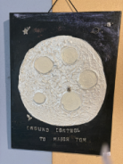 A textured, metallic moon floats in deep space accented with playful cosmic charms. Inspired by Bowie's "Ground Control to Major Tom,' this piece celebrates curiosity, exploration, and the magic of looking up.