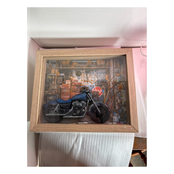 This unique shadowbox features a detailed motorcycle set against a nostalgic garage backdrop, with real-world textures and miniture tools.