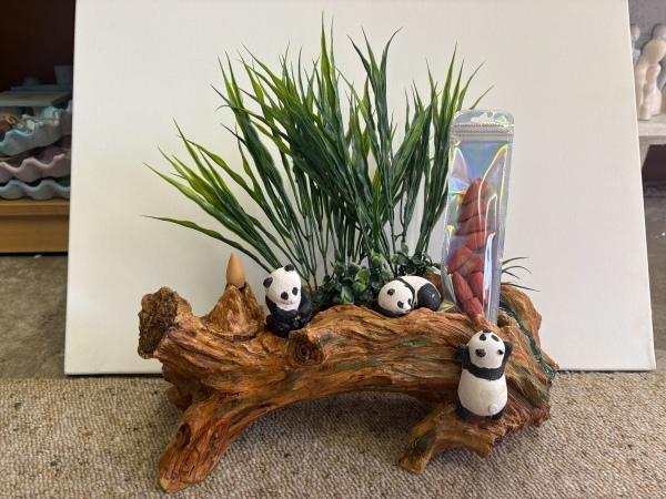 A whimsicle driftwood scene featuring hand crafted pandas, lish greenery, and playful details. This piece brings a touch of nature and joy to any space - perfect for sparking smiles and curiosity.