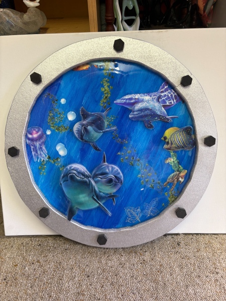 A playful, layered glimpse into ocean life - dolphins, turtles, and jellyfish swim through vibrant blue resin, framed by a metallic porthole. This piece invites you to explore the wonder and joy beneath the waves.