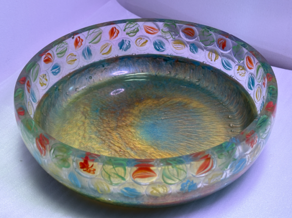 A vibrant, hand-poured resin bowl with a playful marbled rim. Perfect for serving, display, or adding a splash of color to any space.
