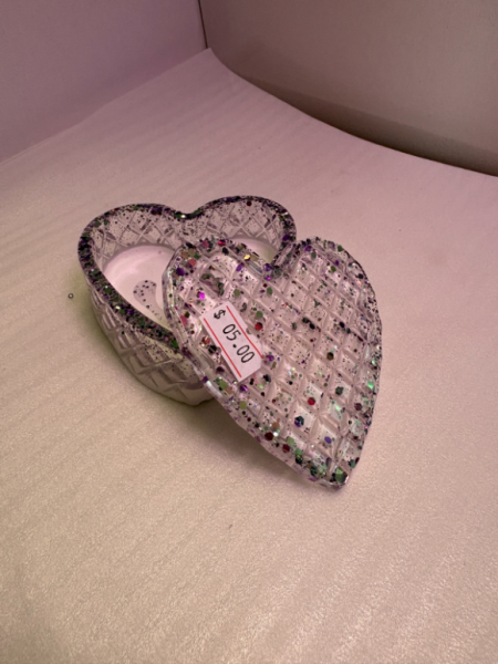 Add a touch of sparkle to your space with this charming heart-shaped trinket box. Crafted from clear resin and resincrete sprinkled with colorful glitter and confetti, its perfect for holding rings, earrings, or other tiny treasures.